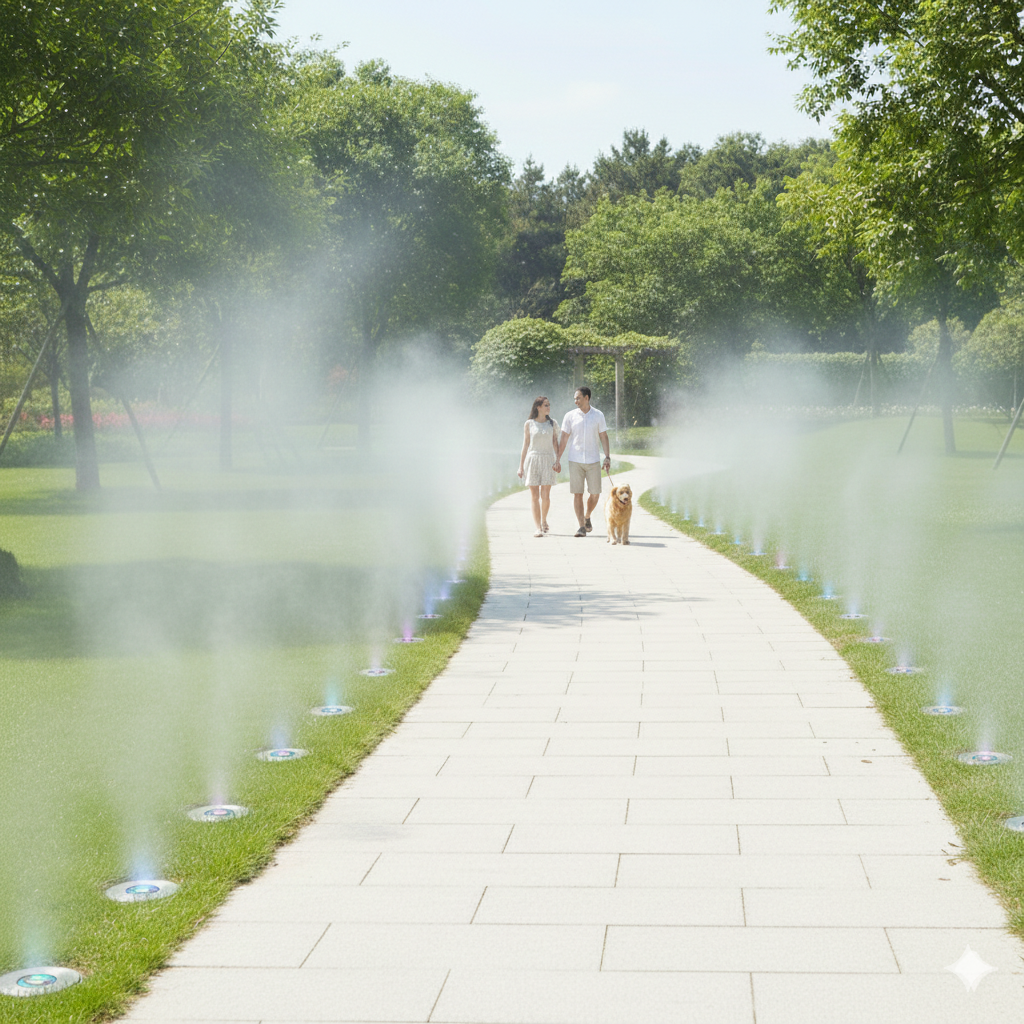 초미립 안개 분무로 체감온도를 효과적으로 저감하고 쾌적한 보행 환경 제공