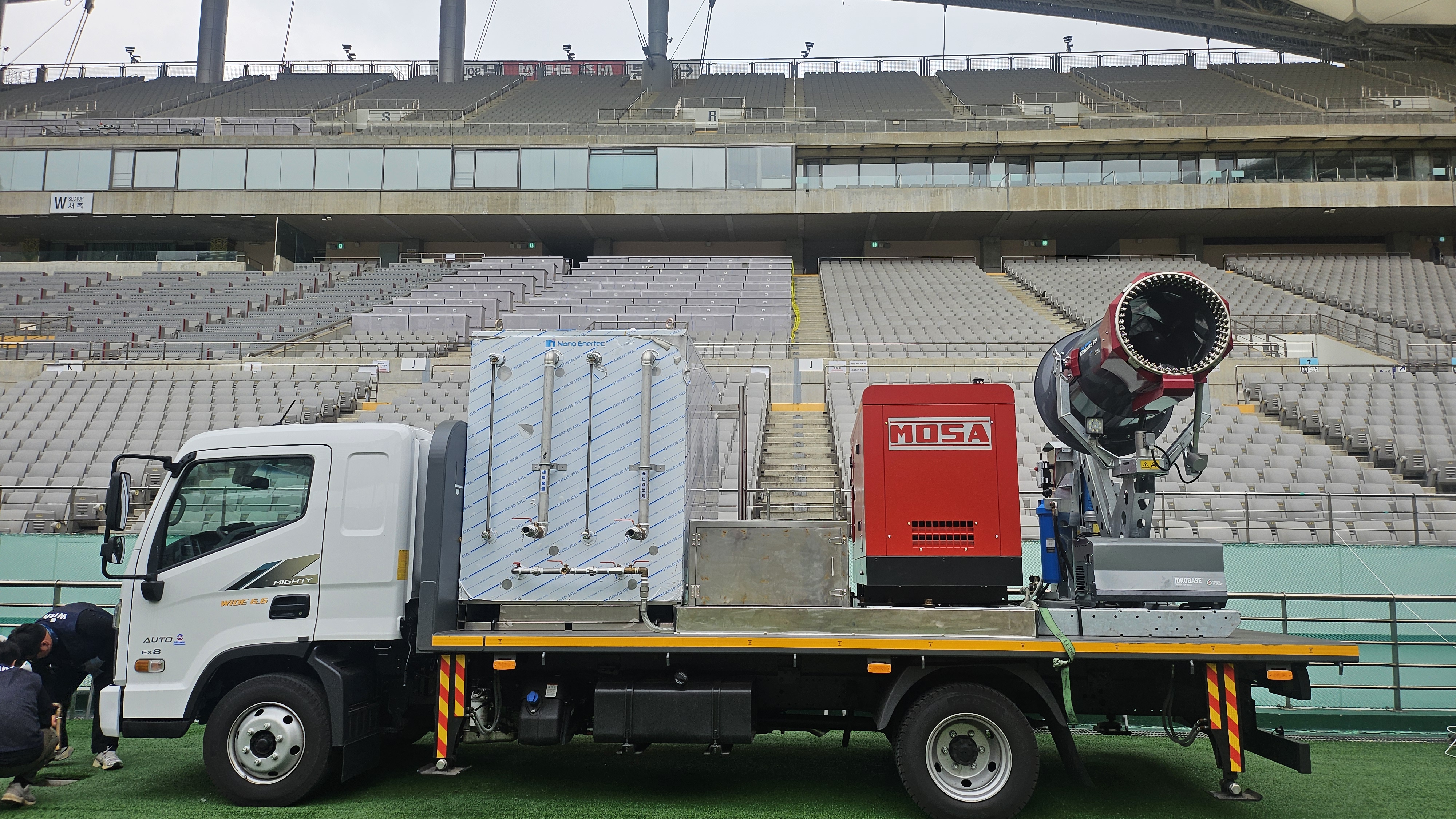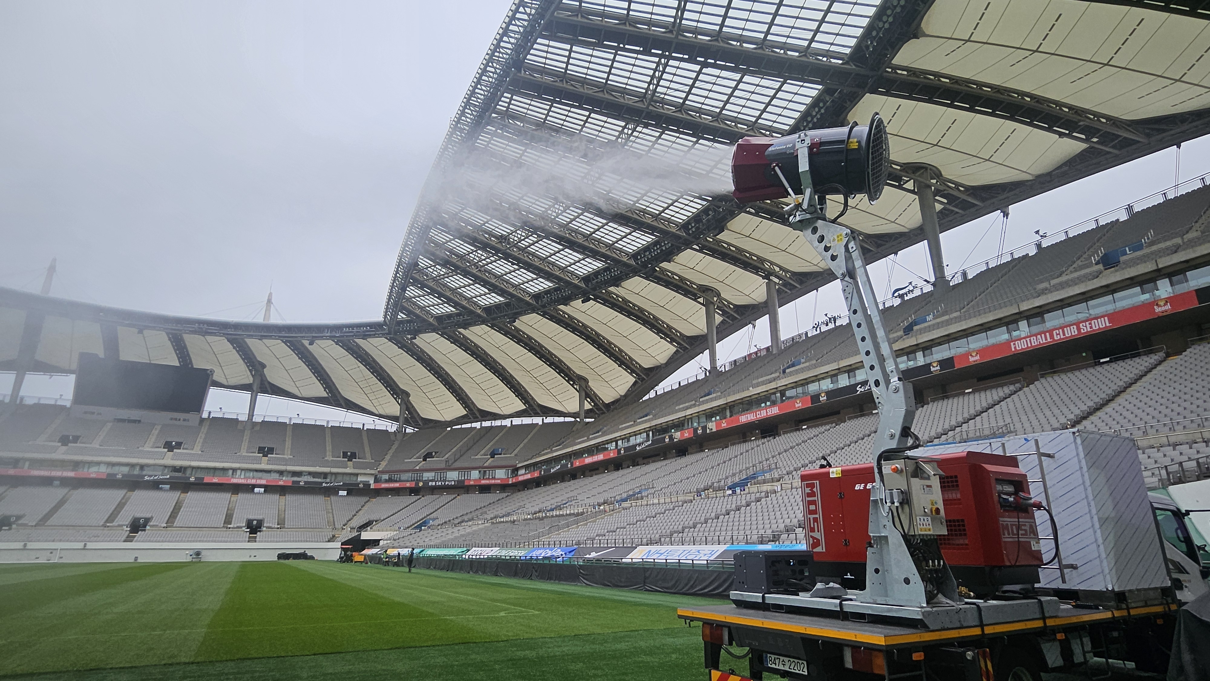 - 온도/습도 조절: 18마이크론(μm)의 초미세 안개 입자가 증발하며 경기장 지표면 온도를 효과적으로 낮추고, 잔디 생육에 최적화된 습도를 유지합니다.