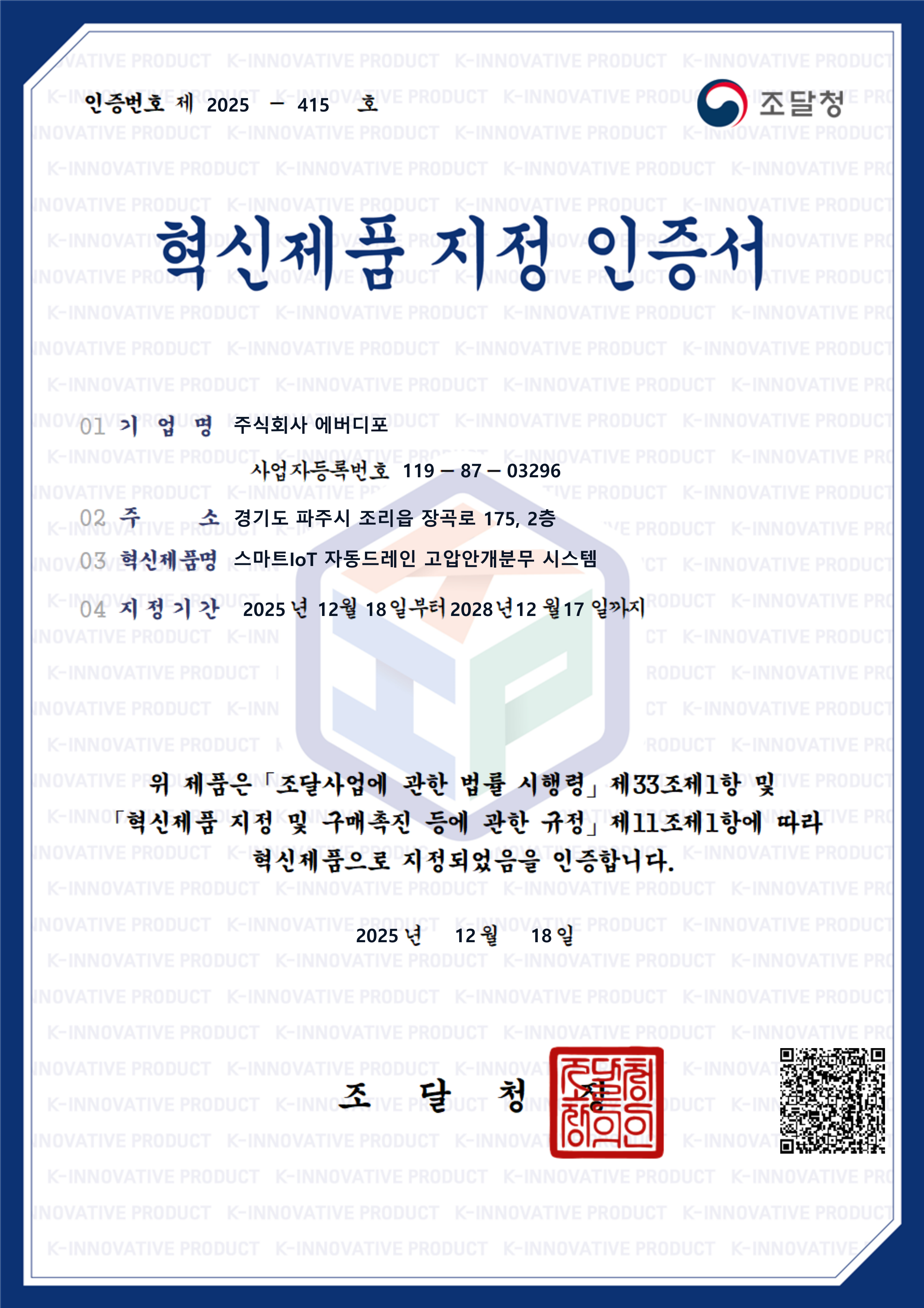혁신제품 등록 - 스마트IoT자동드레인 고압안개분무 시스템